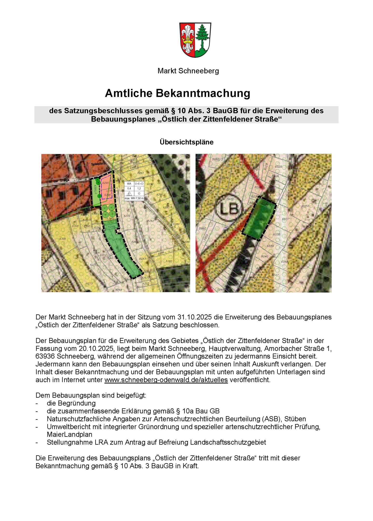 Bekanntmachung des Satzungsbeschlusses gemäß § 10 Abs. 3 Bauslegung gemäß § 3 Abs. 2 BauGB für die Erweiterung des Bebauungsplanes „Östlich der Zittenfeldener Straße“